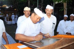 Dalam kesempatan tersebut, Pj. Gubernur Bali juga menyerahkan dana punia, menandatangani prasasti pembangunan Kori Agung Mandala Tengah yang pembiayaannya berasal dari Pemerintah Provinsi Bali, serta menyerahkan buku Kitab Suci Weda kepada para pemangku setempat.